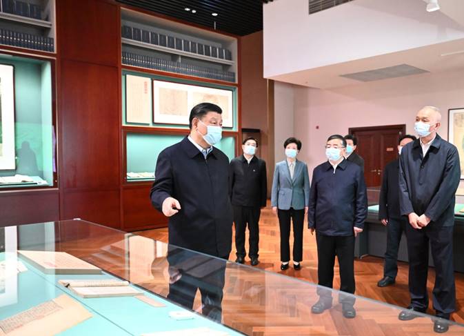 6月2日,中共中央总书记、国家主席、中央军委主席习近平在北京出席文化传承发展座谈会并发表重要讲话。这是座谈会前,习近平1日下午在中国国家版本馆考察。新华社记者 王晔 摄
